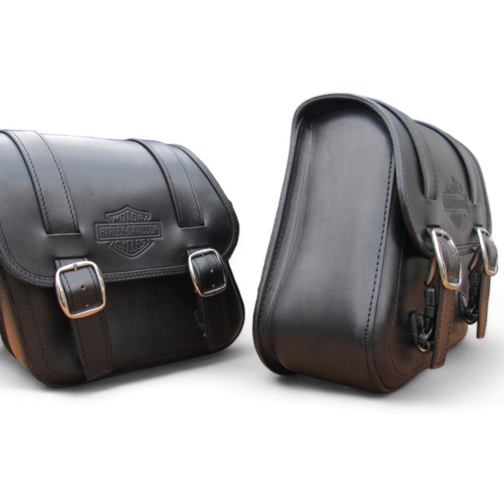 Las alforjas Black Hawk custom leathers tienen un estilo sólido y delicado que complementa las características oscuras de tu harley.
